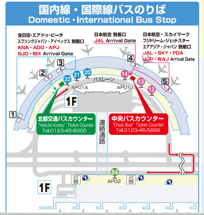 日本航空、スカイマーク、フジドリーム、ジェットスター 到着口正面にある北海道中央バスのカウンターに向かい、乗車券購入後、14番のりばへ。